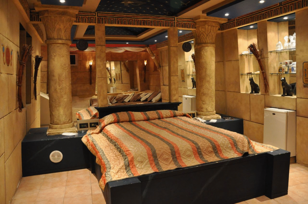 5. Египетские иероглифы и геометрические узоры (полосы, меандр) на стенах, мебели и занавесках.